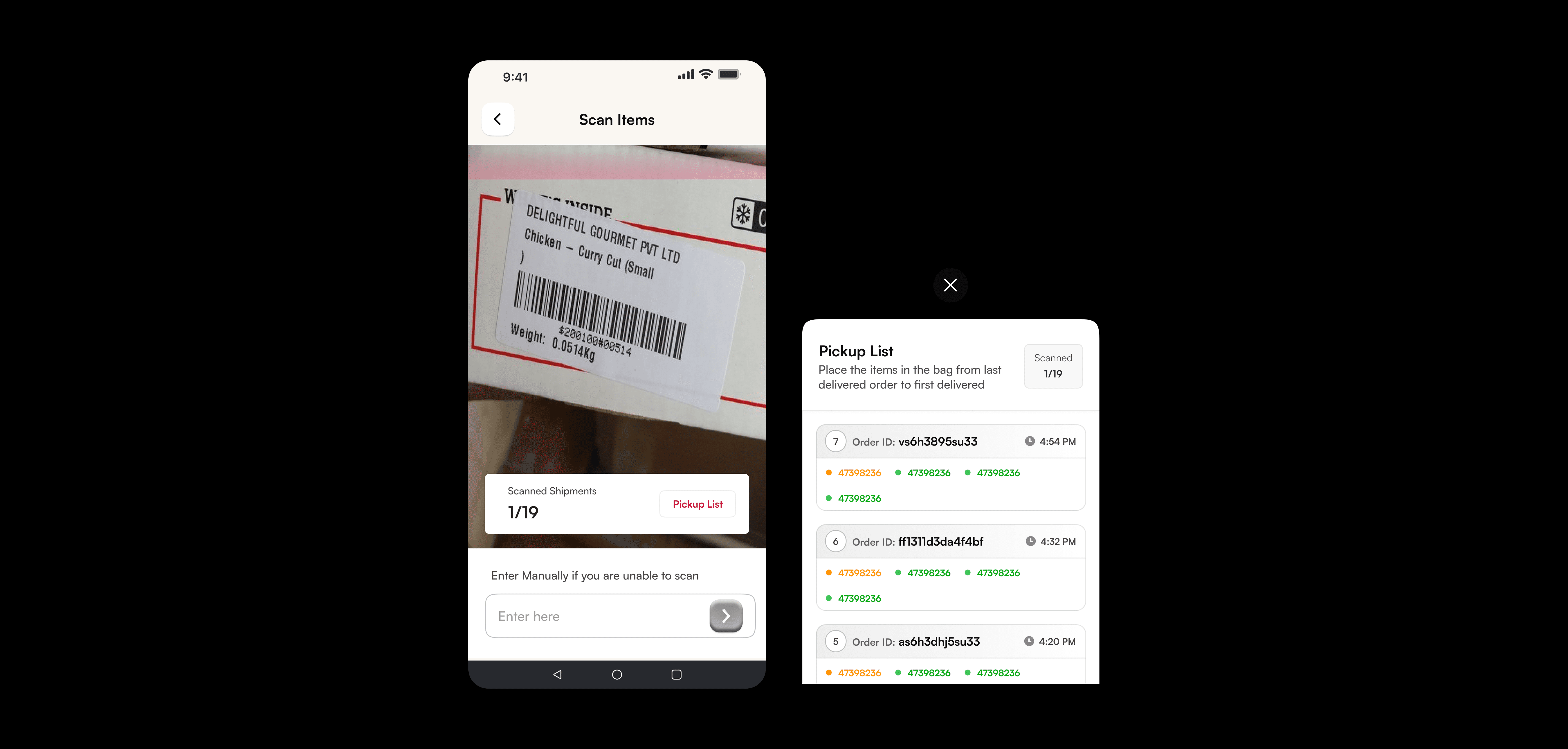 The new Pickup List view displays orders in descending delivery order—so the last delivery is scanned and packed first, and the first delivery ends up on top (in the screens below)